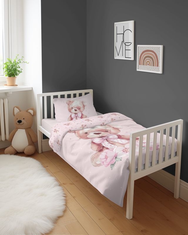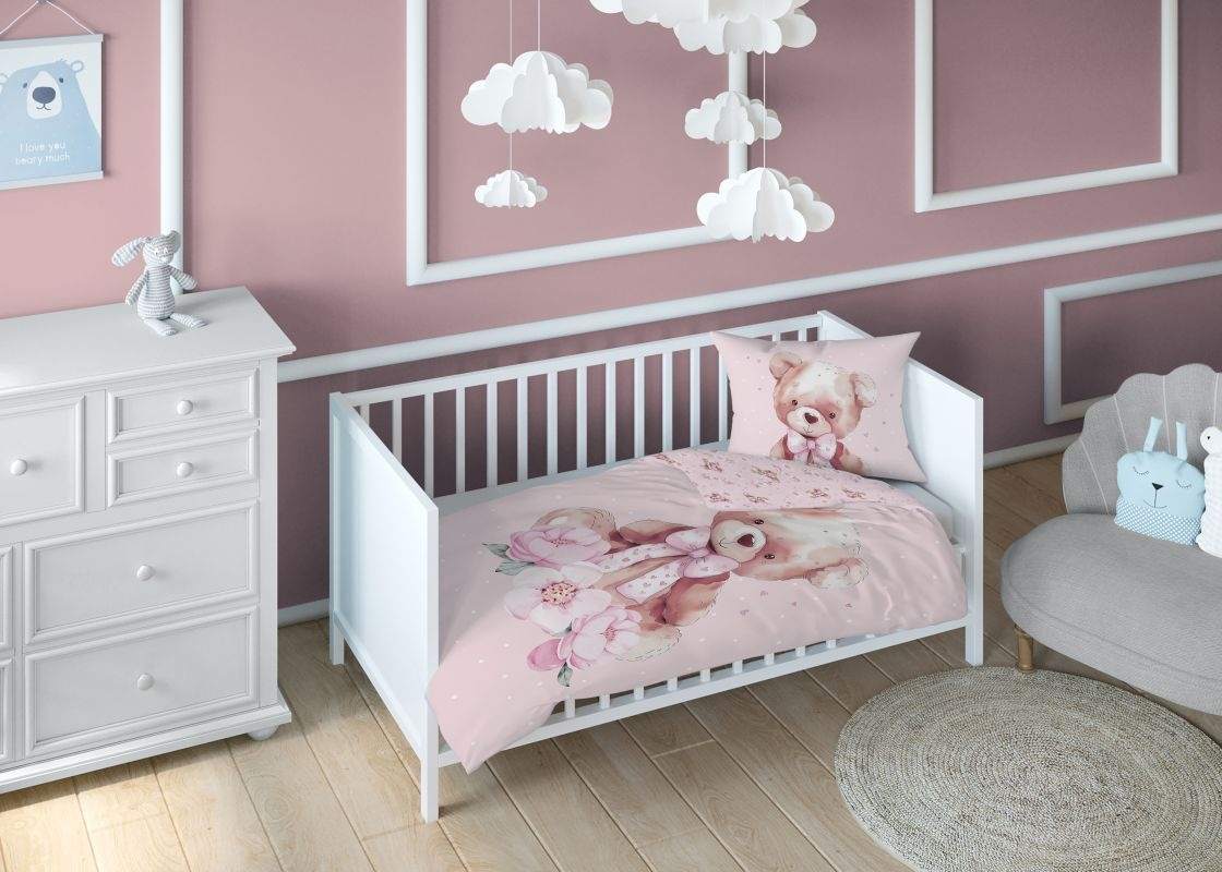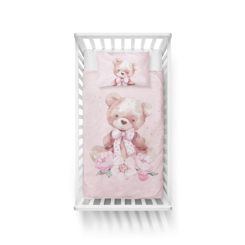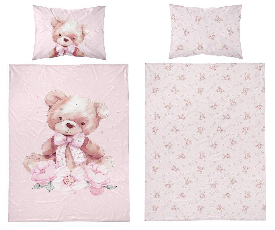 Obliečky do postieľky Macko mašle sú vyrobené z 100 % bavlny a dodávané v rozmeroch 100 × 135 cm (prikrývka) + 40 × 60 cm (vankúš).
