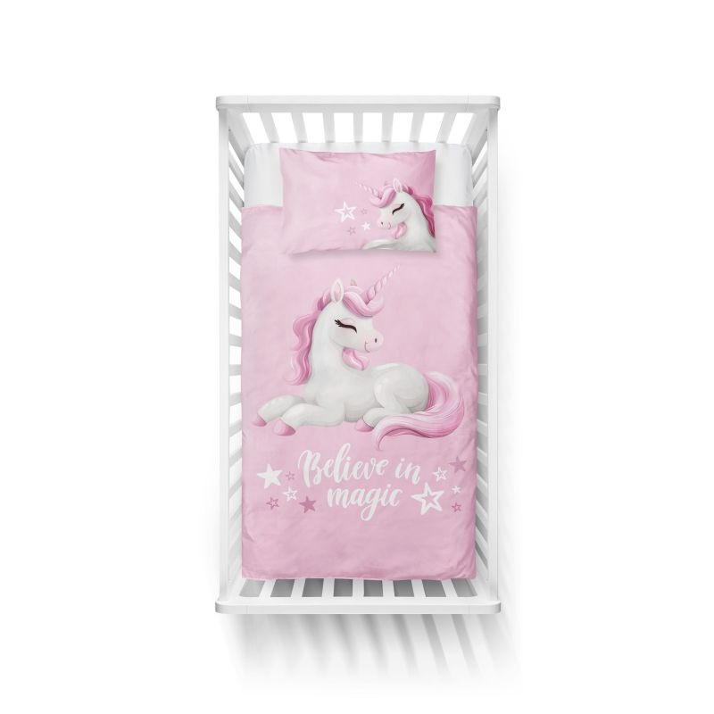 Rozmer 100x135 cm, vankúš 40x60 cm. Bavlnené obliečky do postieľky s motívom sivej Jednorožec ružová. Zapínanie na zips.
