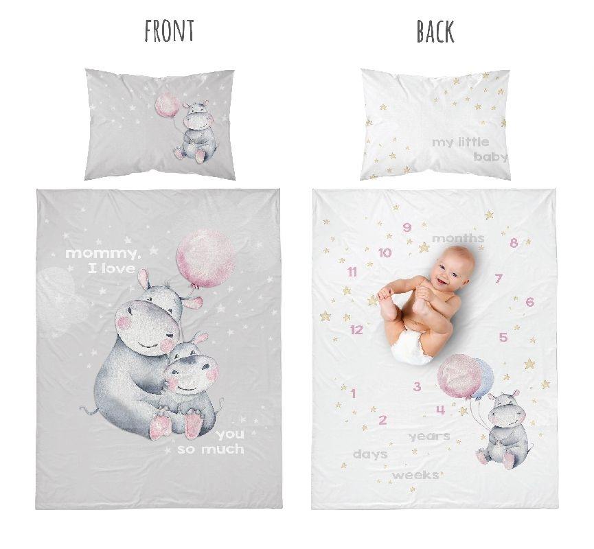 Obliečky postieľka Bambusový hroch Love Grey kombinujú svieži dizajn s jemným hrošíkom a výnimočný bambusovo?bavlnený materiál (50% bambus + 50% bavlna), ktorý je priedušný, savý a vhodný pre citlivú pokožku bábätiek.