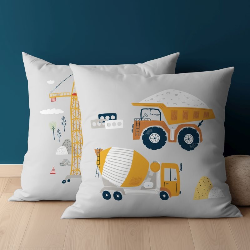 Moderná obliečka na vankúšik s motívom stavebných strojov v šedej farbe, ideálna pre detskú izbu alebo ako darček pre malých staviteľov.