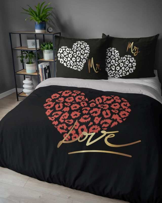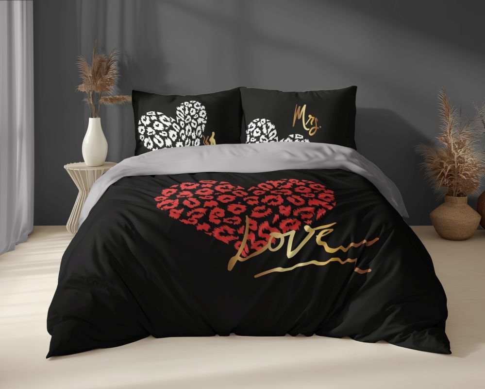 Elegantný a citlivo navrhnutý vzor srdca a bozkov v jemných farbách vytvára harmonickú atmosféru a pôvabné lôžko pre párové spálne.