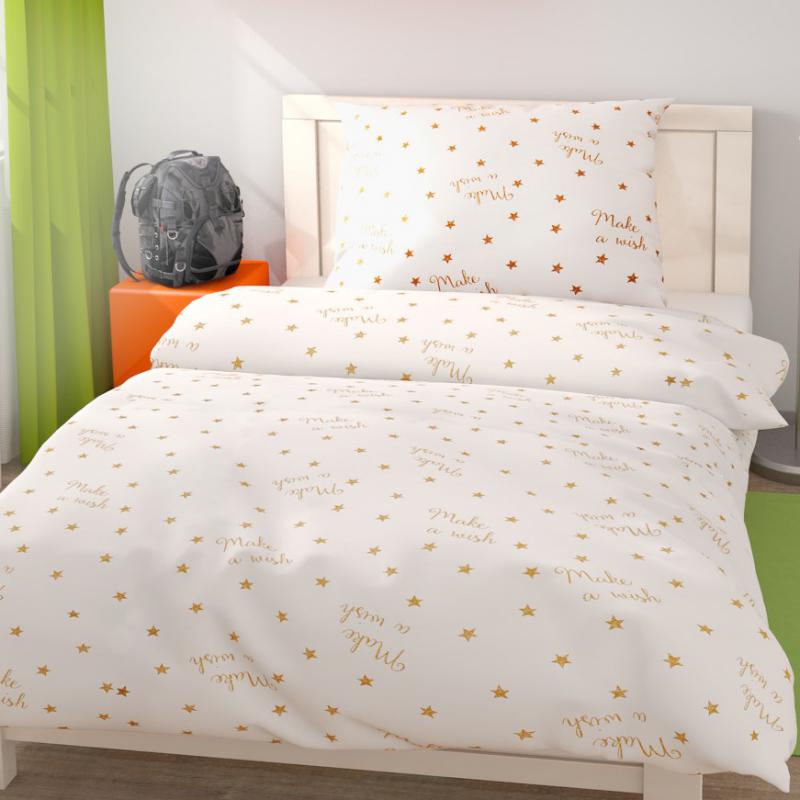 Detské navliečky Stars sú z každej strany rovnaké. Na deke a vankúši sú zlaté hviezdičky