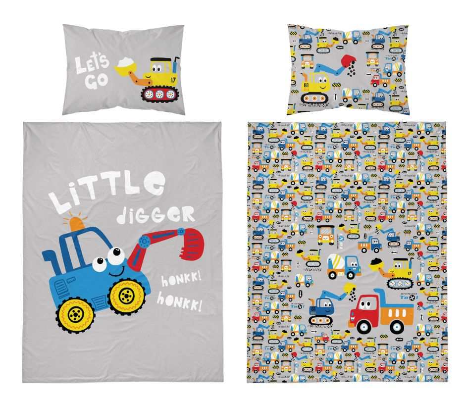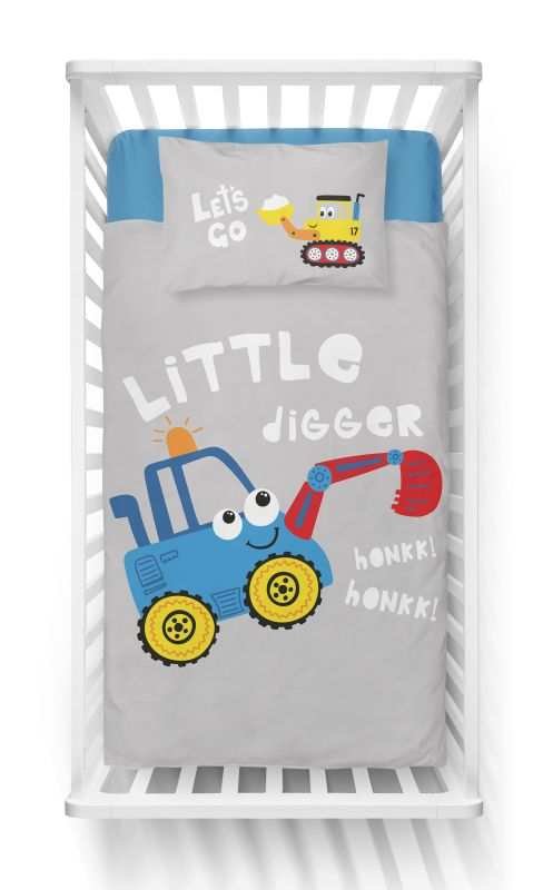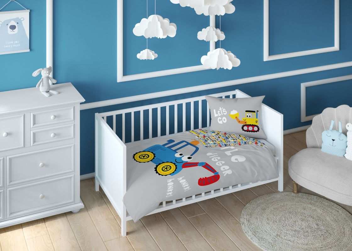 Detské návliečky do postieľky modrý bager sú milým doplnkom do detskej izby, kde utvorí útulné miesto pre spokojný spánok a deti sa nebudú cítiť v postielke sami. Veselý design s kresleným modrým bagríkom s lyžicou na mäkučkej bavlnenej bielizni deti rozveselí a napomôže im bezstarostne zaspať. Zadnú stranu lôžkovin predstavuje drobný vzor stevebných strojov na sivom pozadí.